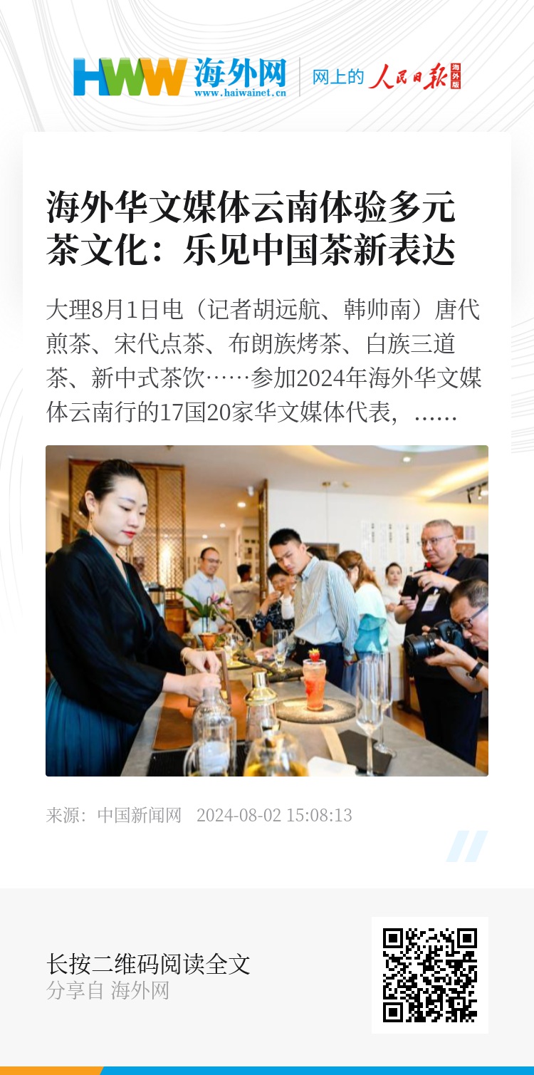 中新网大理8月1日电(记者胡远航、韩帅南)唐代煎茶、宋代点茶、布朗族烤茶、白族三道茶、新中式茶饮……参加2024年海外华文媒体云南行的17国20家华文媒体代表,被连日来体验的多元茶文化所吸引。埃及《中国周报》副社长朱新娥感慨,“仍在持续创新的中国茶文化,将被全世界更多人所喜爱。”
