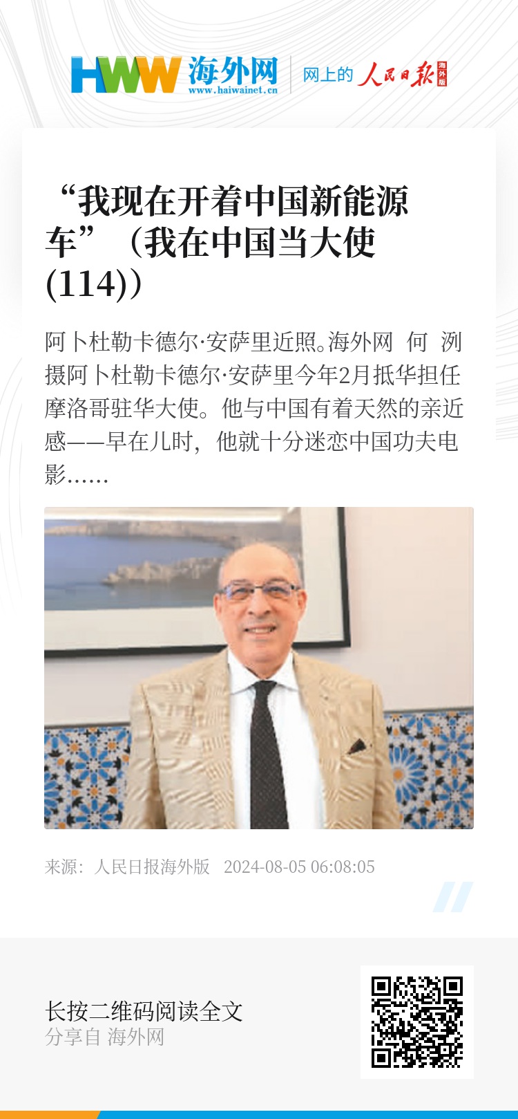 “我现在就开着一辆中国产的新能源汽车!”安萨里兴奋地说,摩洛哥已经推出一系列可再生能源发展政策,计划在2030年前实现可再生能源发电率52%的目标。他希望在担任驻华大使期间能吸引更多投资到摩洛哥。
