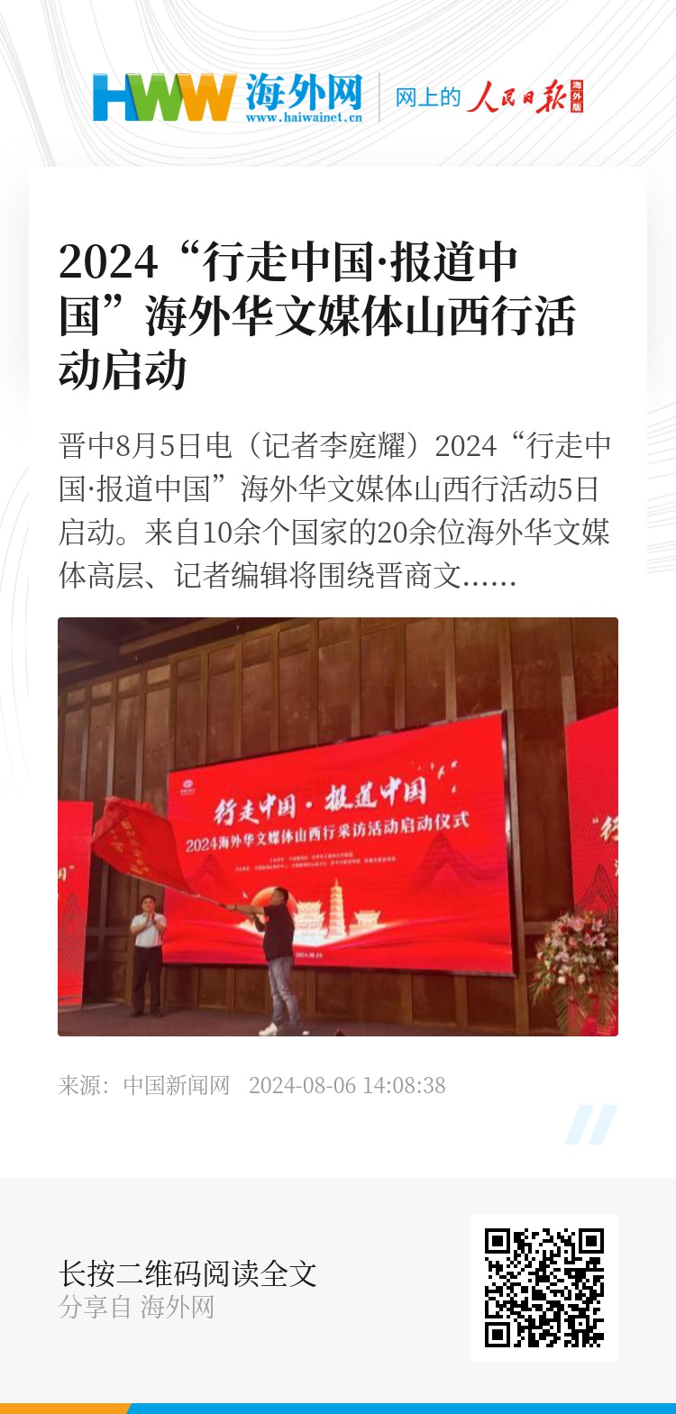 此次活动由中国新闻社、世界华文媒体合作联盟联合主办,中国新闻社海外中心、中国新闻社山西分社、晋中市委宣传部、晋城市委宣传部共同承办。采访团将走进山西省晋中市、晋城市,开展为期5天的联合采访。