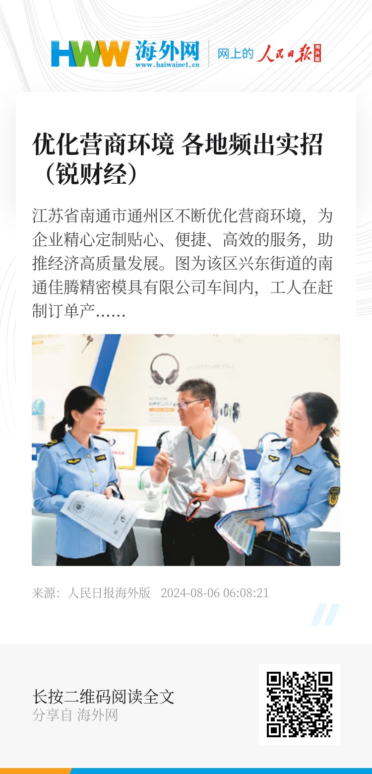 营商环境是一个地方经济发展的“软实力”。近期,中国不少地方纷纷出台简化办事流程、支持科技创新、优化监管服务模式、降低中小企业负担、提升知识产权保护效能等新一轮优化营商环境举措,增强企业高质量发展的信心和底气。分析人士认为,相关举措坚持问题导向,聚焦企业反映的突出问题,从企业实际需求出发,将让广大经营主体有更多实实在在的获得感。