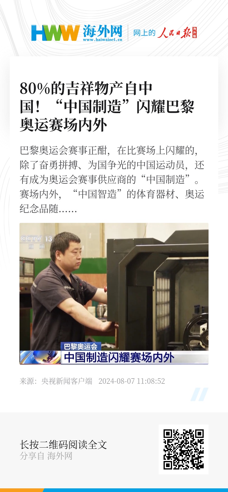 巴黎奥运会赛事正酣,在比赛场上闪耀的,除了奋勇拼搏、为国争光的中国运动员,还有成为奥运会赛事供应商的“中国制造”。赛场内外,“中国智造”的体育器材、奥运纪念品随处可见,向世界展示着中国制造科技创新的实力。