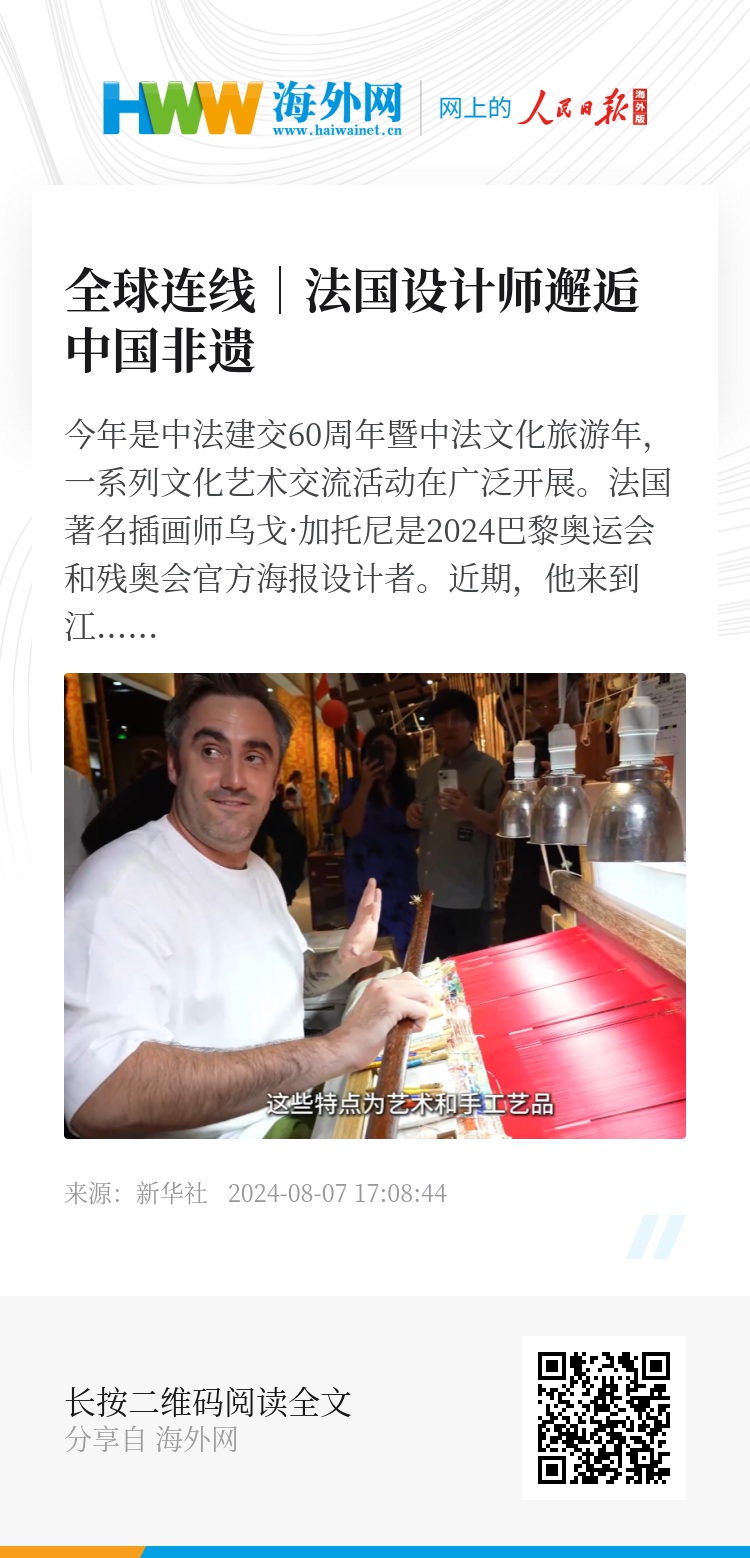 今年是中法建交60周年暨中法文化旅游年,一系列文化艺术交流活动在广泛开展。法国著名插画师乌戈·加托尼是2024巴黎奥运会和残奥会官方海报设计者。近期,他来到江苏南京探访云锦博物馆,并与非遗传承人共同创作艺术作品,开启一场中法艺术畅想。