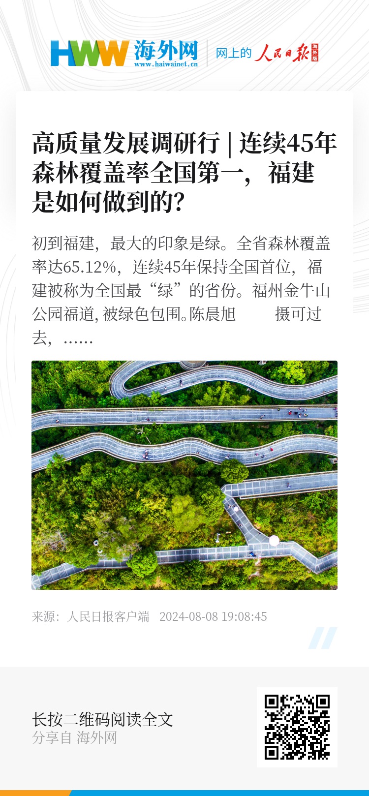 全省森林覆盖率达65.12%,连续45年保持全国首位,福建被称为全国最“绿”的省份。
