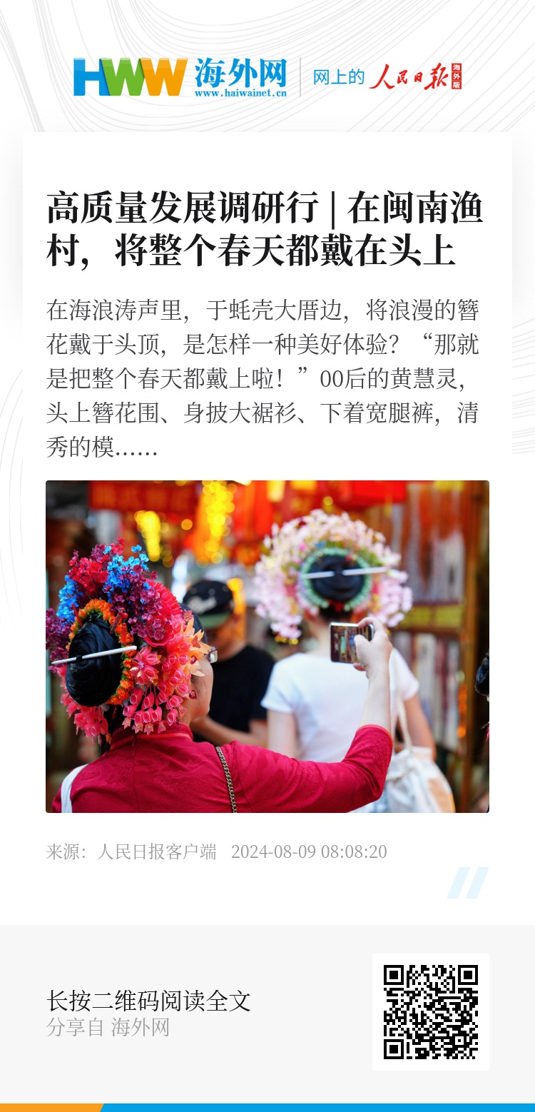 “那就是把整个春天都戴上啦!”00后的黄慧灵,头上簪花围、身披大裾衫、下着宽腿裤,清秀的模样更添几分古风遗韵。走进福建省泉州市丰泽区东海街道蟳埔社区,四处可见像黄慧灵一般漂亮精致的“蟳埔渔女”,成为这个闽南渔村亮丽的风景。