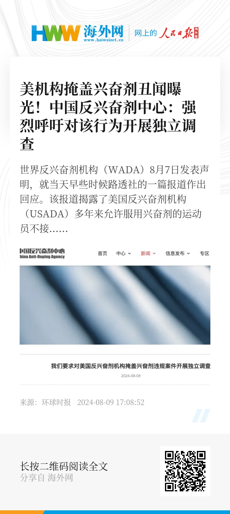 “鉴于美国田径领域根深蒂固的种种‘污点’,以及USADA屡次置程序和标准于不顾,我们有理由怀疑美国田径领域存在系统性使用兴奋剂的问题,美国田径领域的兴奋剂阳性事件值得持续彻查和关注。”中国反兴奋剂中心表示,正如WADA主席班卡所强调的:“世界各地执法机构都已告诉WADA,美国是一个销售和分销提高成绩药物的巨大市场。”世界反兴奋剂机构在近期发表的声明中提到,在东京奥运会赛前的一年中,31%的美国运动员没有得到充分的兴奋剂检测。基于以上情况,我们强烈呼吁国际检测机构(ITA)在巴黎奥运会期间加大对美国田径运动员的兴奋剂检查频率,同时强烈建议田径诚信委员会(AIU)加强对美国田径运动项目的反兴奋剂监管,严防严查其运动员兴奋剂问题隐患,切实维护各国干净运动员的合法权益,重树全球运动员对公平竞赛的信心。