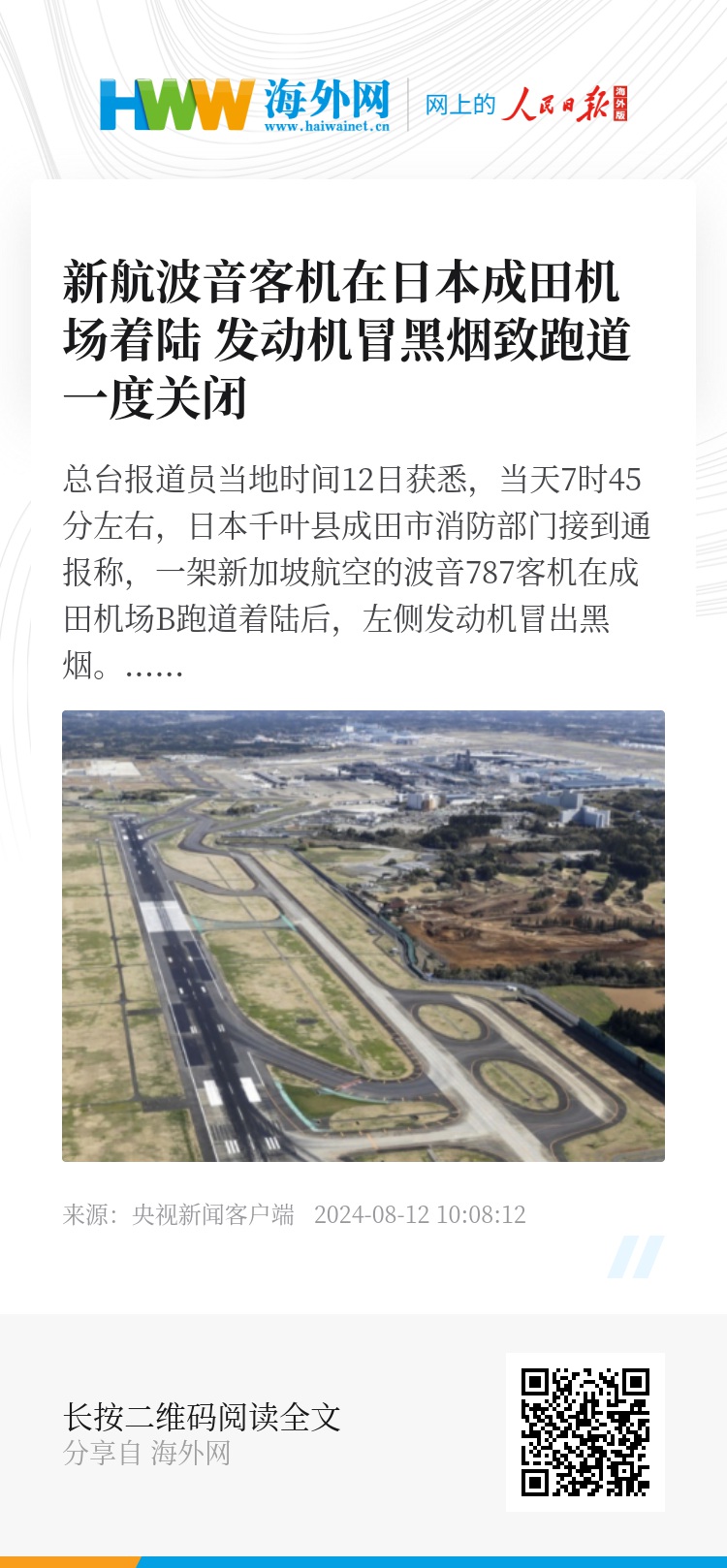 总台报道员当地时间12日获悉,当天7时45分左右,日本千叶县成田市消防部门接到通报称,一架新加坡航空的波音787客机在成田机场B跑道着陆后,左侧发动机冒出黑烟。成田市消防部门称,事件未造成人员受伤。