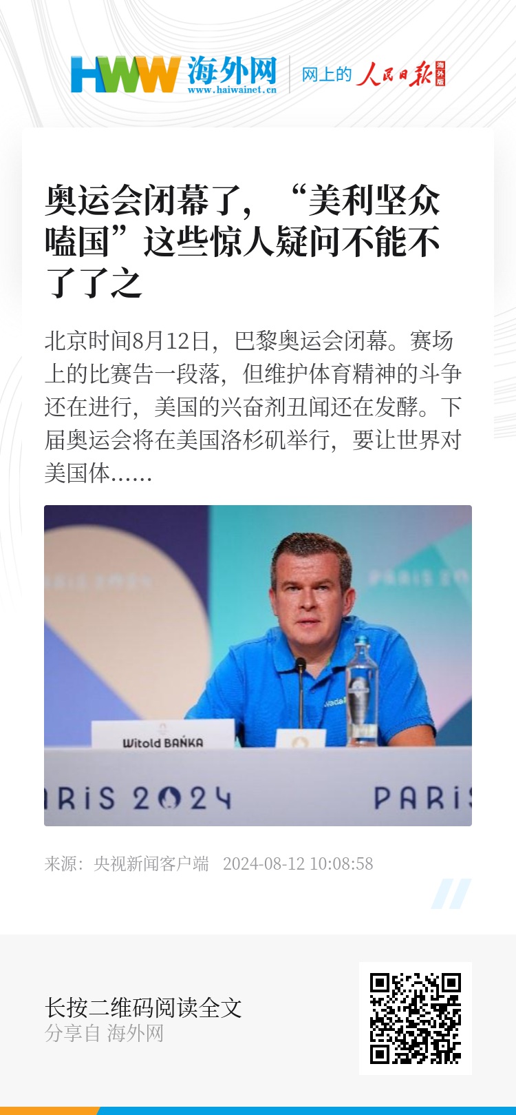 北京时间8月12日,巴黎奥运会闭幕。赛场上的比赛告一段落,但维护体育精神的斗争还在进行,美国的兴奋剂丑闻还在发酵。下届奥运会将在美国洛杉矶举行,要让世界对美国体育重拾信心,美国首先要向全世界解释,围绕这届奥运的这么多“美式离奇事件”,到底是怎么回事?