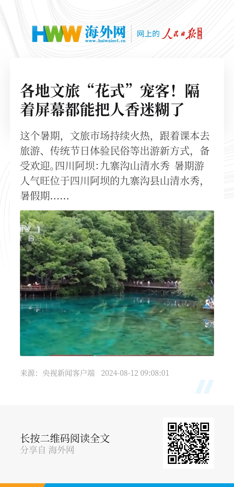 位于四川阿坝的九寨沟县山清水秀,暑假期间,各地游客纷至沓来,饱览独特风光,感受九寨魅力。除九寨沟景区外,当地的神仙池、爱情海等景区也吸引了不少游客。据了解,2024年上半年,九寨沟县共接待游客350万人次,同比增长23.8%;旅游收入36.4亿元。