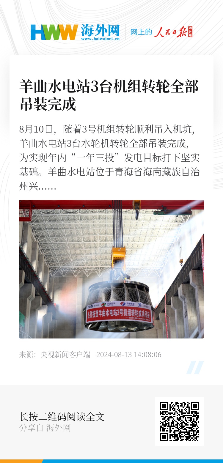 8月10日,随着3号机组转轮顺利吊入机坑,羊曲水电站3台水轮机转轮全部吊装完成,为实现年内“一年三投”发电目标打下坚实基础。