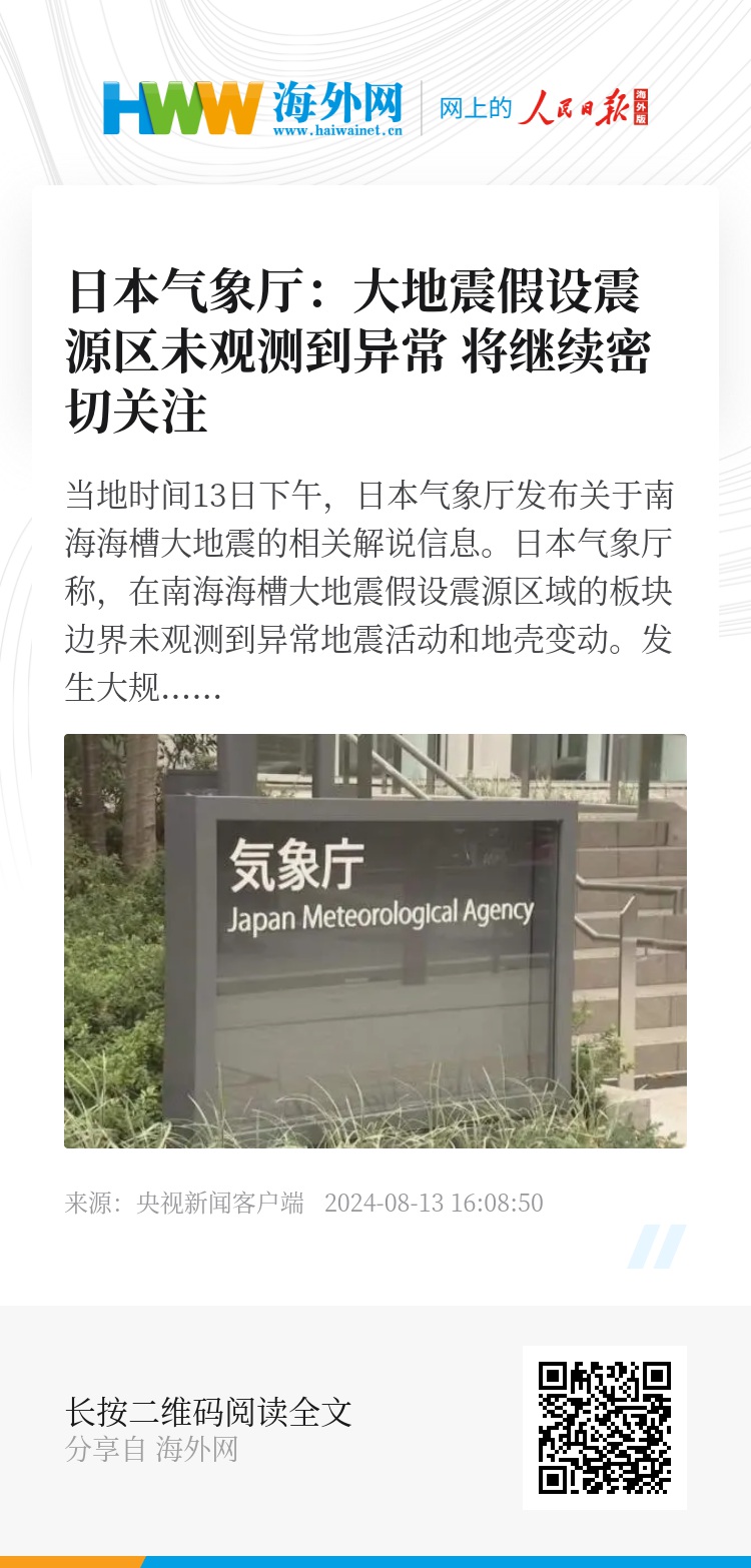 当地时间13日下午,日本气象厅发布关于南海海槽大地震的相关解说信息。日本气象厅称,在南海海槽大地震假设震源区域的板块边界未观测到异常地震活动和地壳变动。发生大规模地震的可能性比平时高,将继续密切关注这一区域相关动向。