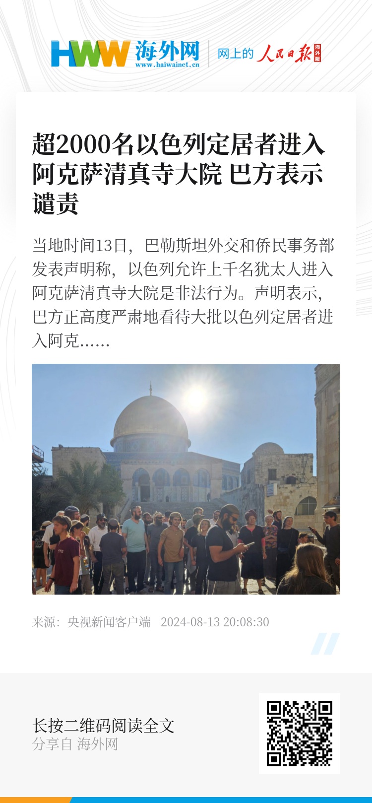 当地时间13日,巴勒斯坦外交和侨民事务部发表声明称,以色列允许上千名犹太人进入阿克萨清真寺大院是非法行为。声明表示,巴方正高度严肃地看待大批以色列定居者进入阿克萨清真寺大院一事,并称这可能导致事态进一步升级。