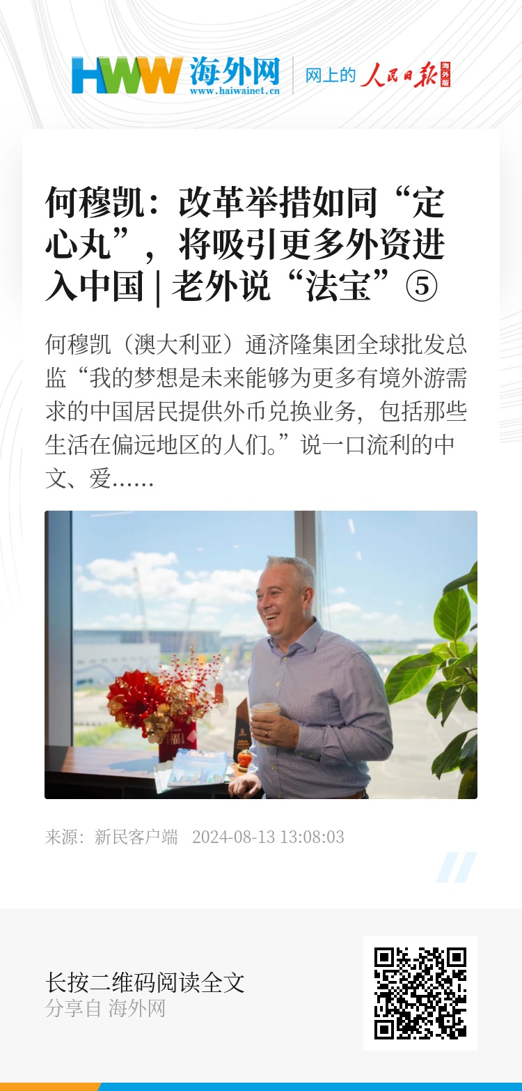 无论所在公司还是个人,都是中国改革开放的受益者,这也让何穆凯无比期待中国共产党二十届三中全会的召开。“第一时间读了全会公报后,我对中国进一步全面深化改革和持续开放充满信心,相信多达300余项的改革举措,必将给中国和世界带来更大的机遇。”