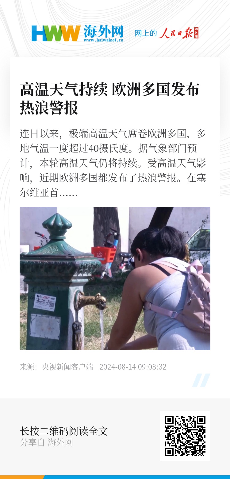 连日以来,极端高温天气席卷欧洲多国,多地气温一度超过40摄氏度。据气象部门预计,本轮高温天气仍将持续。