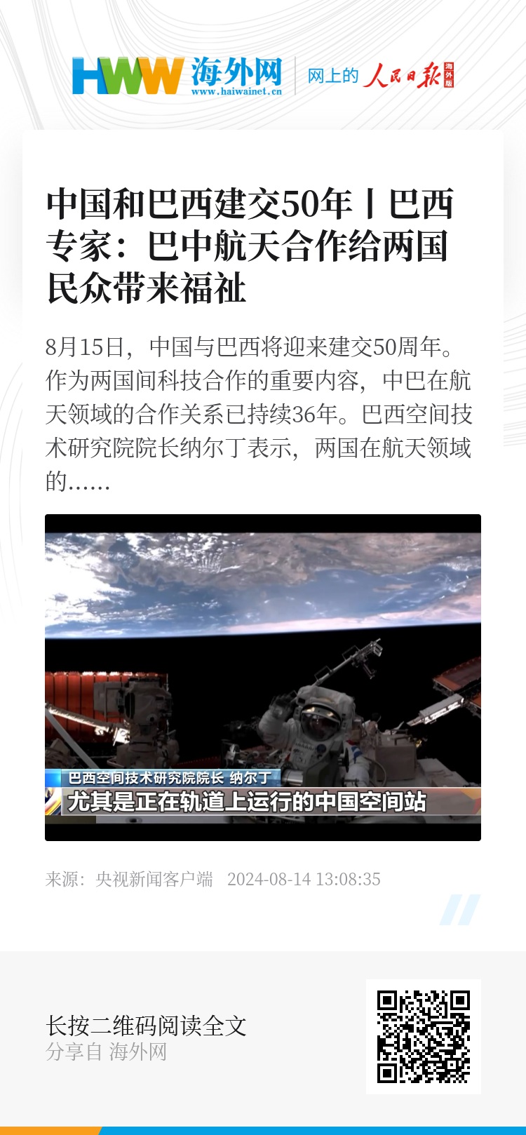 8月15日,中国与巴西将迎来建交50周年。作为两国间科技合作的重要内容,中巴在航天领域的合作关系已持续36年。巴西空间技术研究院院长纳尔丁表示,两国在航天领域的合作,给两国民众带来了实实在在的福祉。