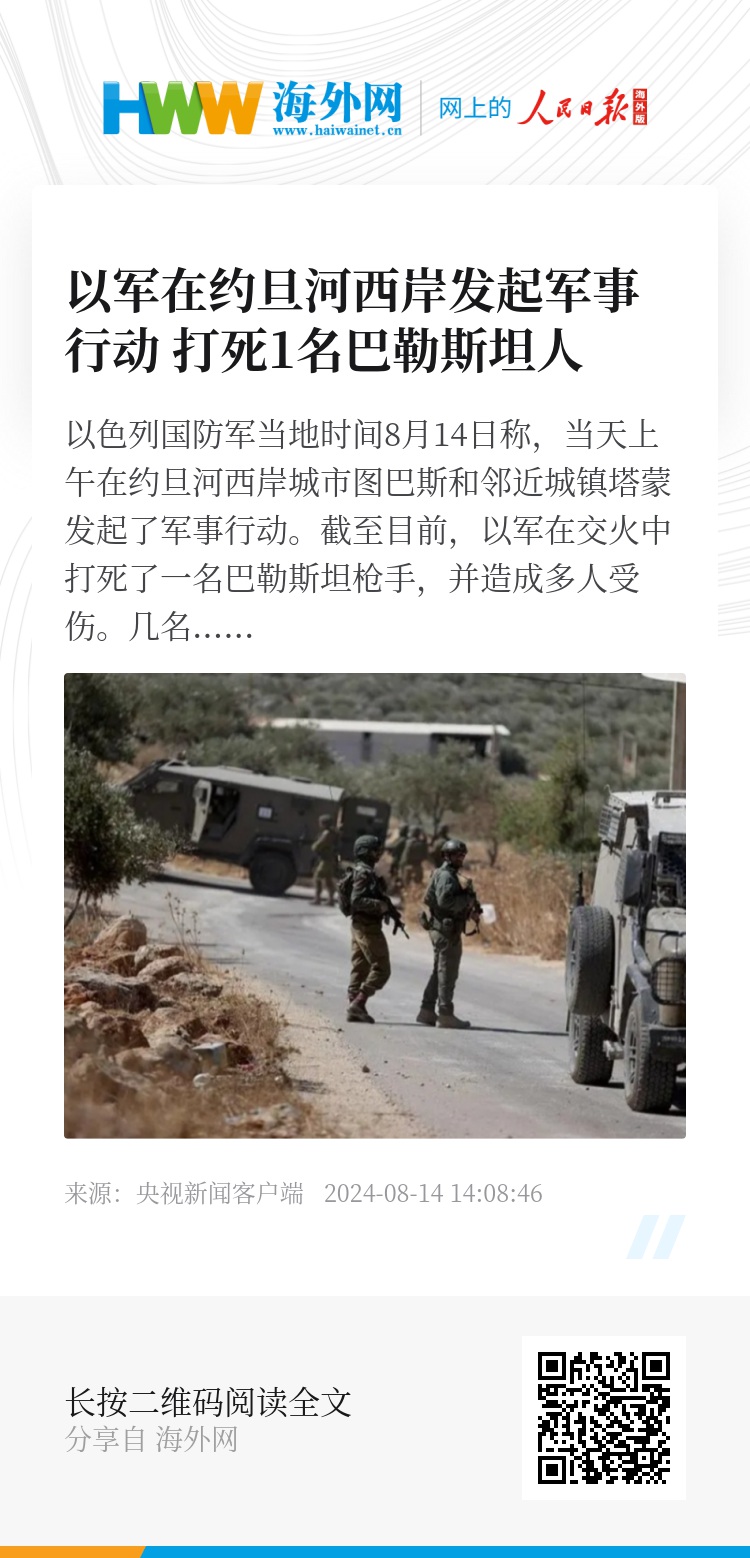 以色列国防军当地时间8月14日称,当天上午在约旦河西岸城市图巴斯和邻近城镇塔蒙发起了军事行动。