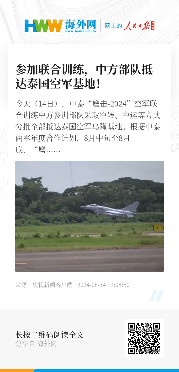 根据中泰两军年度合作计划,8月中旬至8月底,“鹰击-2024”联合训练在泰国空军乌隆基地举行,中方派出歼击机、歼轰机、直升机等多型飞机及特战力量参训。