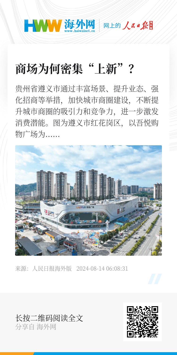 贵州省遵义市通过丰富场景、提升业态、强化招商等举措,加快城市商圈建设,不断提升城市商圈的吸引力和竞争力,进一步激发消费潜能。图为遵义市红花岗区,以吾悦购物广场为主的吾悦商圈。罗星汉摄(人民视觉)