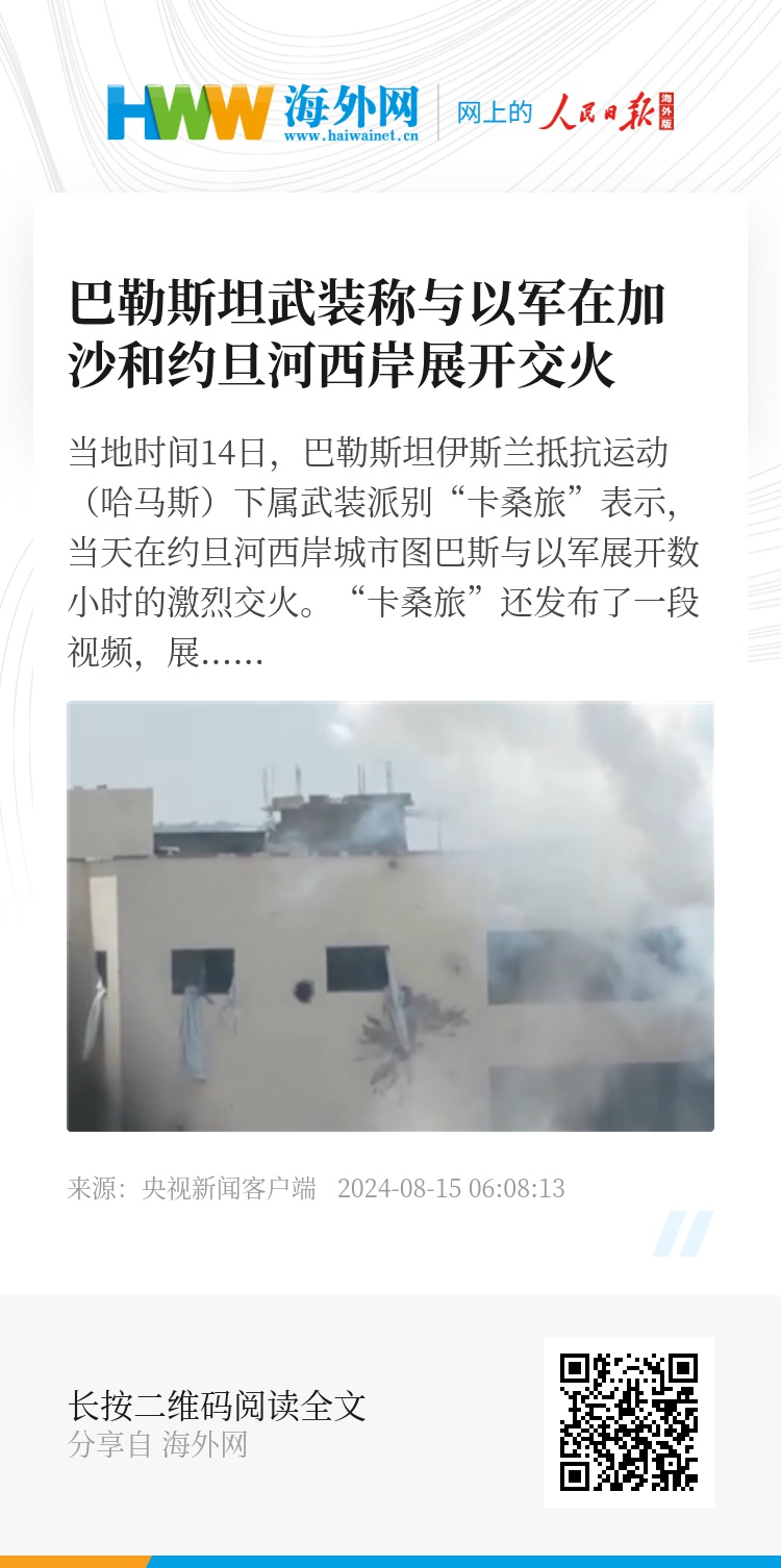 巴勒斯坦伊斯兰圣战组织(杰哈德)下属武装派别“圣城旅”14日表示,当天用迫击炮袭击了位于“纳扎里姆走廊”补给线上的以军士兵。“圣城旅”还发布了一段视频,展示其武装人员针对以军在汗尤尼斯北部的指挥中心展开炮轰。(总台记者 魏然)