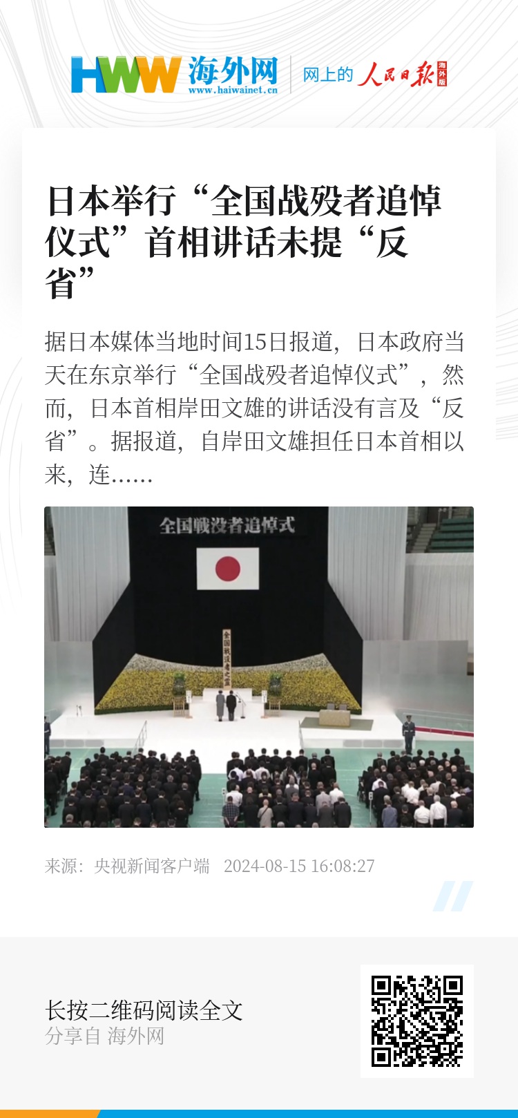 据日本媒体当地时间15日报道,日本政府当天在东京举行“全国战殁者追悼仪式”,然而,日本首相岸田文雄的讲话没有言及“反省”。