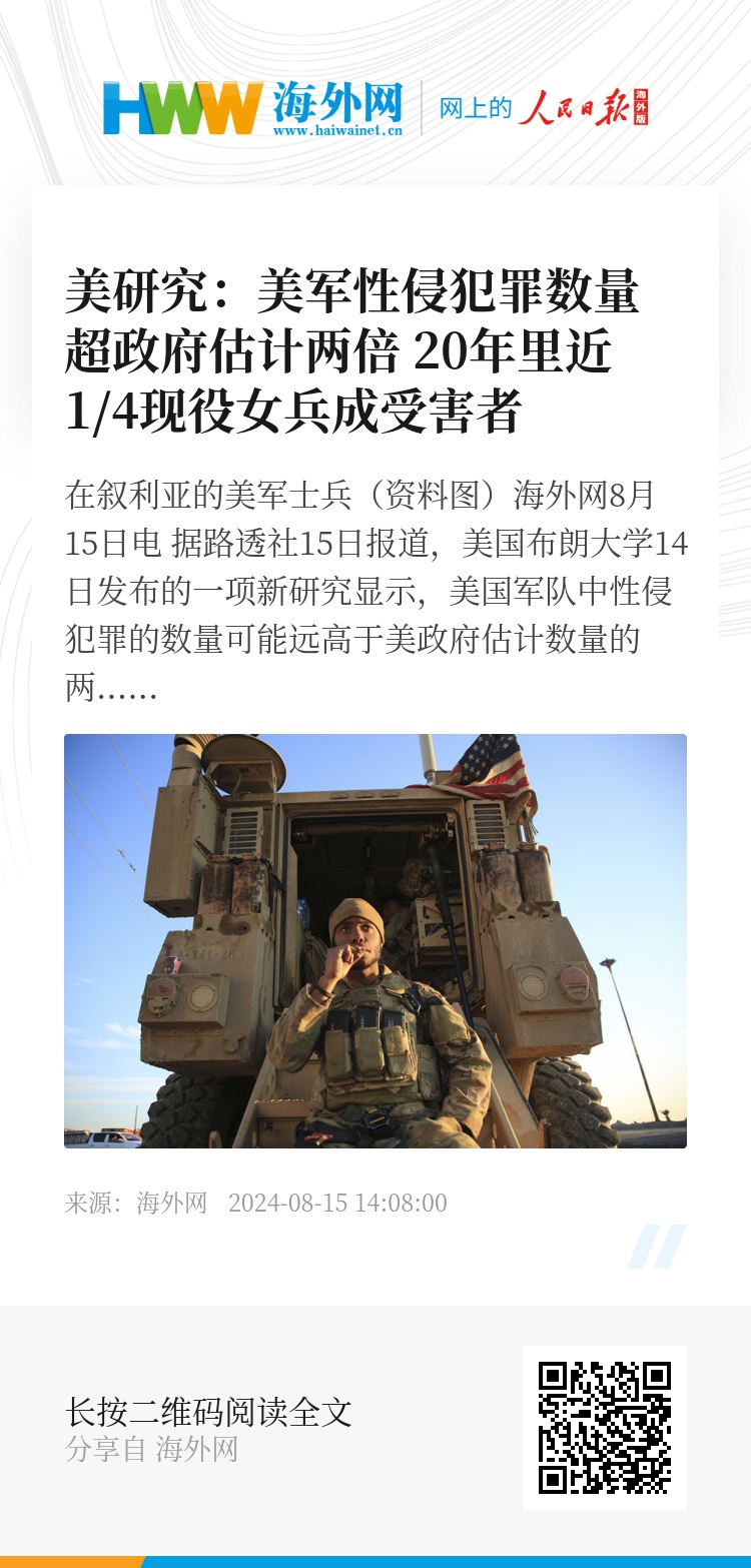 美国国防部估计,2021年军队性侵犯案件约为3.59万起,2023年约为2.9万起。但布朗大学沃森国际与公共事务研究所发布的这项研究显示,2021年美军性侵犯案件数量为75569起,2023年为73695起,是美军方估计数据的两倍多。研究显示,2001年至2021年阿富汗战争期间,平均有近1/4的美军现役女兵和1.9%的美军现役男兵遭受过性侵犯罪的伤害,黑人女兵更容易遭受性骚扰和性侵犯。