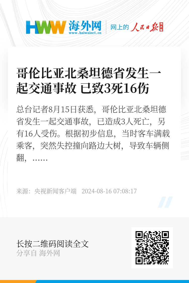 总台记者8月15日获悉,哥伦比亚北桑坦德省发生一起交通事故,已造成3人死亡,另有16人受伤。