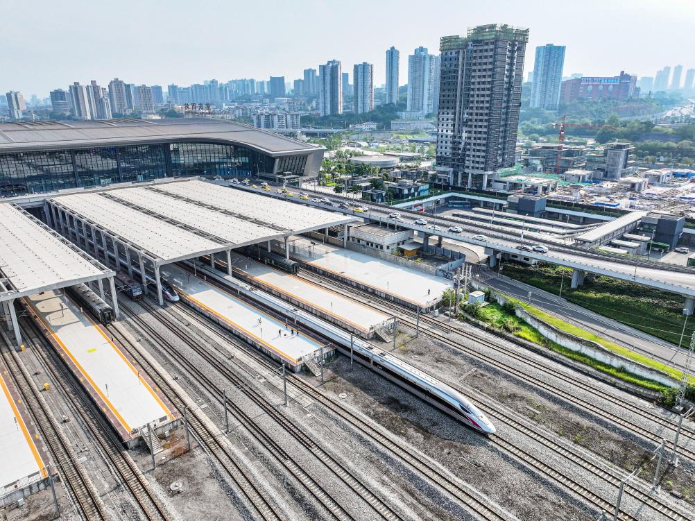 8月16日,渝昆高铁渝宜段进入运行试验阶段,检测车从重庆西站驶出(无人机照片)。新华社记者唐奕摄