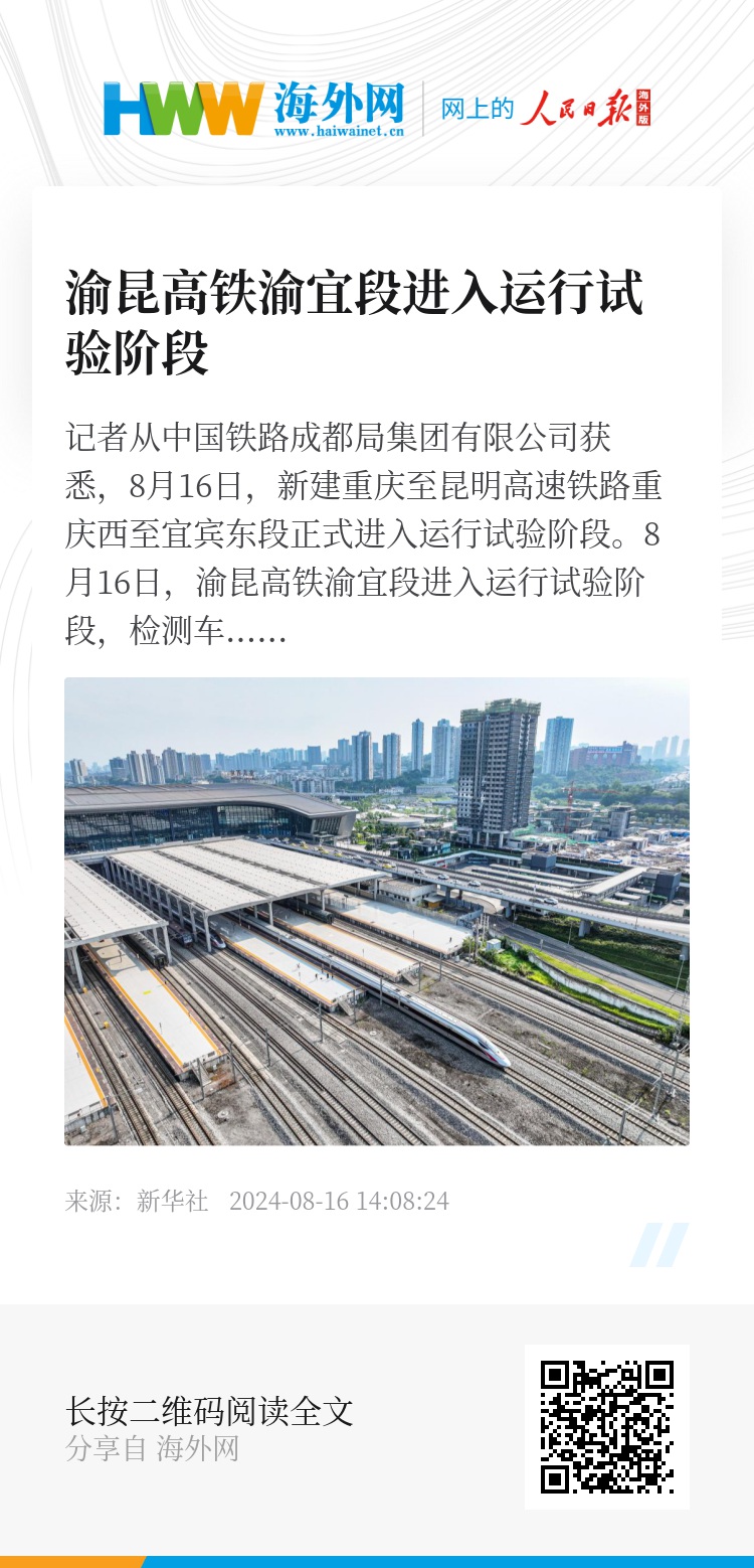 记者从中国铁路成都局集团有限公司获悉,8月16日,新建重庆至昆明高速铁路重庆西至宜宾东段正式进入运行试验阶段。
