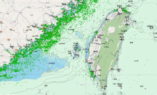 ||台湾海峡航行船舶实时分布情况(绿点代表正在台湾海峡航行的船只)