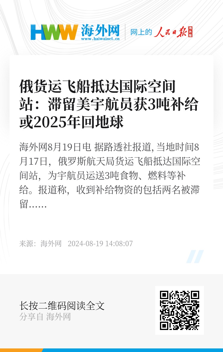 报道称,收到补给物资的包括两名被滞留的美国宇航员。美国航空航天局(NASA)证实,俄货运飞船将在国际空间站停留大约6个月,再返回地球大气层处理垃圾。