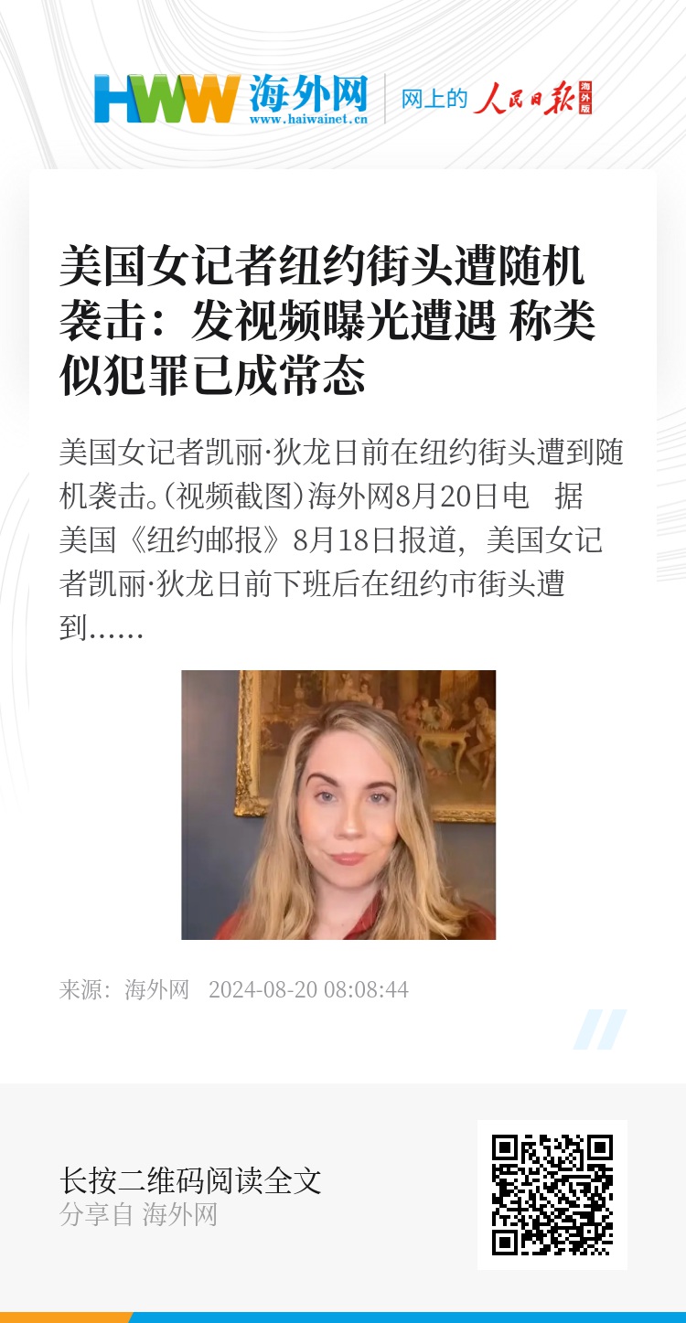 海外网8月20日电 据美国《纽约邮报》8月18日报道,美国女记者凯丽·狄龙日前下班后在纽约市街头遭到陌生男子的随机袭击。她在事后发布视频,称当地政府官员试图掩盖最近发生的暴力事件。