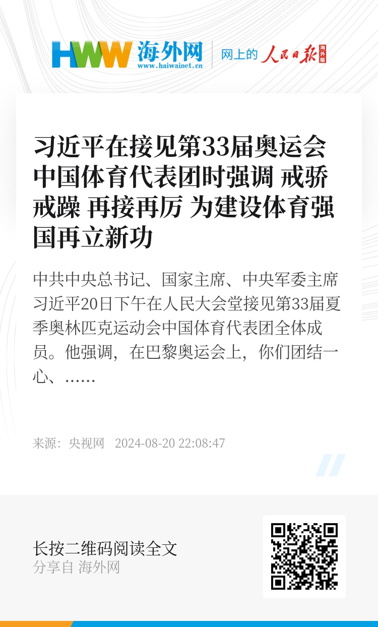 中共中央总书记、国家主席、中央军委主席习近平20日下午在人民大会堂接见第33届夏季奥林匹克运动会中国体育代表团全体成员。他强调,在巴黎奥运会上,你们团结一心、顽强拼搏,奋勇争先、不负使命,取得我国参加夏季奥运会境外参赛历史最好成绩,实现了比赛成绩和精神文明双丰收,为祖国和人民赢得了荣誉。他代表党中央和国务院欢迎大家凯旋,向大家致以热烈祝贺和诚挚慰问,并向全国体育战线的同志们表示亲切问候。