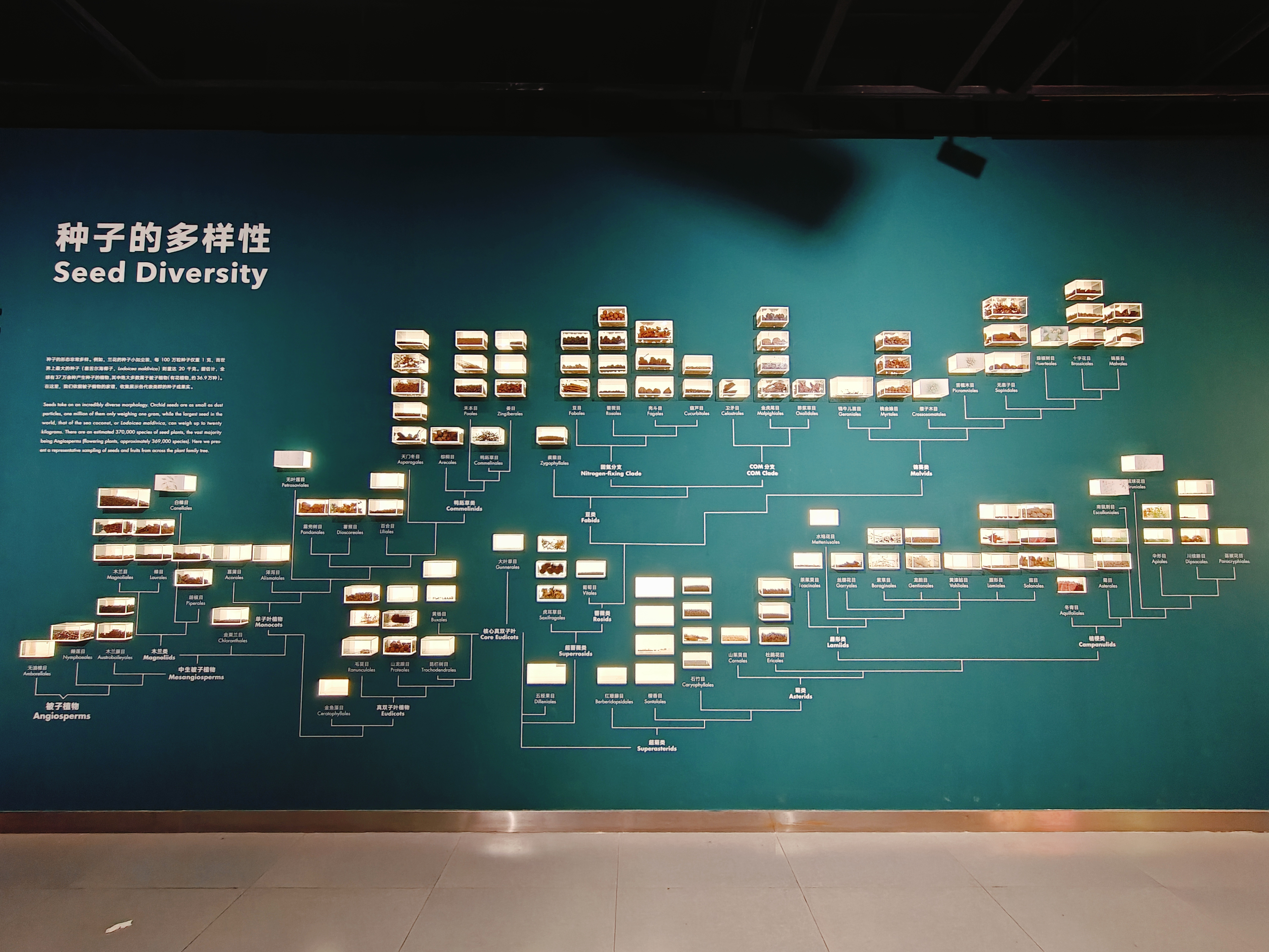 种子的形态多样。斑叶兰种子小如尘埃,5万粒只有0.025克;而世界上最大的种子塞舌尔海椰子,却重达20公斤。更有如望天树这样“聪明”的植物,它的种子长出果翅,乘风借力,旋转飘落远方。据估计,全球有37万余种产生种子的植物。博物馆内的种子“家谱”,展示着自然界的丰富多彩和生物多样性。
