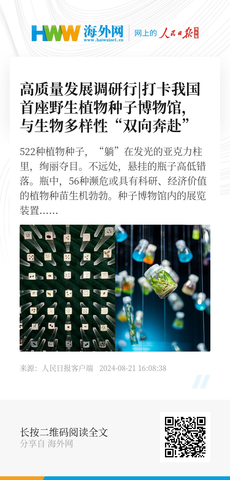 522种植物种子,“躺”在发光的亚克力柱里,绚丽夺目。不远处,悬挂的瓶子高低错落。瓶中,56种濒危或具有科研、经济价值的植物种苗生机勃勃。