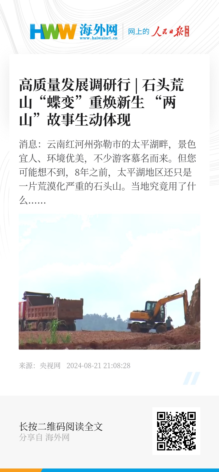 央视网消息:云南红河州弥勒市的太平湖畔,景色宜人、环境优美,不少游客慕名而来。但您可能想不到,8年之前,太平湖地区还只是一片荒漠化严重的石头山。当地究竟用了什么样的方法,在短短几年里让荒山披绿、石漠开花,生态文明建设结出了累累硕果?