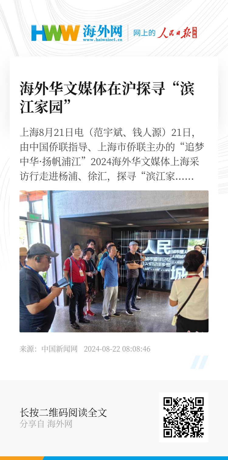 中新网上海8月21日电(范宇斌、钱人源)21日,由中国侨联指导、上海市侨联主办的“追梦中华·扬帆浦江”2024海外华文媒体上海采访行走进杨浦、徐汇,探寻“滨江家园”。