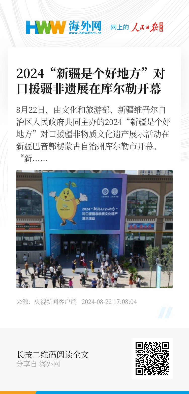 8月22日,由文化和旅游部、新疆维吾尔自治区人民政府共同主办的2024“新疆是个好地方”对口援疆非物质文化遗产展示活动在新疆巴音郭楞蒙古自治州库尔勒市开幕。