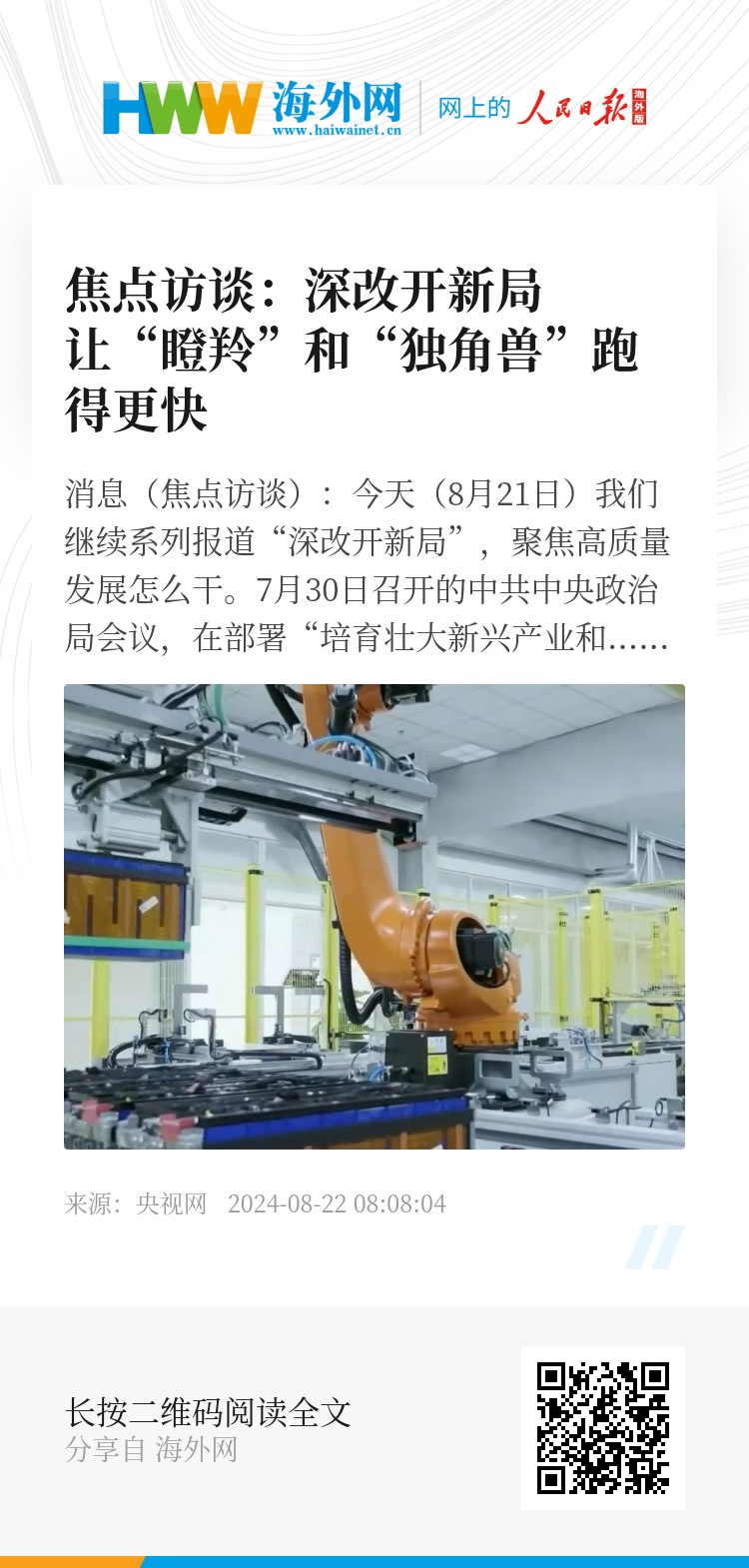 央视网消息(焦点访谈):今天(8月21日)我们继续系列报道“深改开新局”,聚焦高质量发展怎么干。7月30日召开的中共中央政治局会议,在部署“培育壮大新兴产业和未来产业”任务时特别强调,对瞪羚企业和独角兽企业的发展,支持要“有力、有效”。那么,什么是瞪羚企业?什么是独角兽企业?目前,对这些企业有哪些支持政策呢?我们一起去苏州看看。