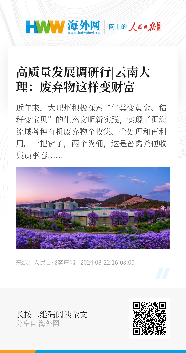 近年来,大理州积极探索“牛粪变黄金、秸秆变宝贝”的生态文明新实践,实现了洱海流域各种有机废弃物全收集、全处理和再利用。