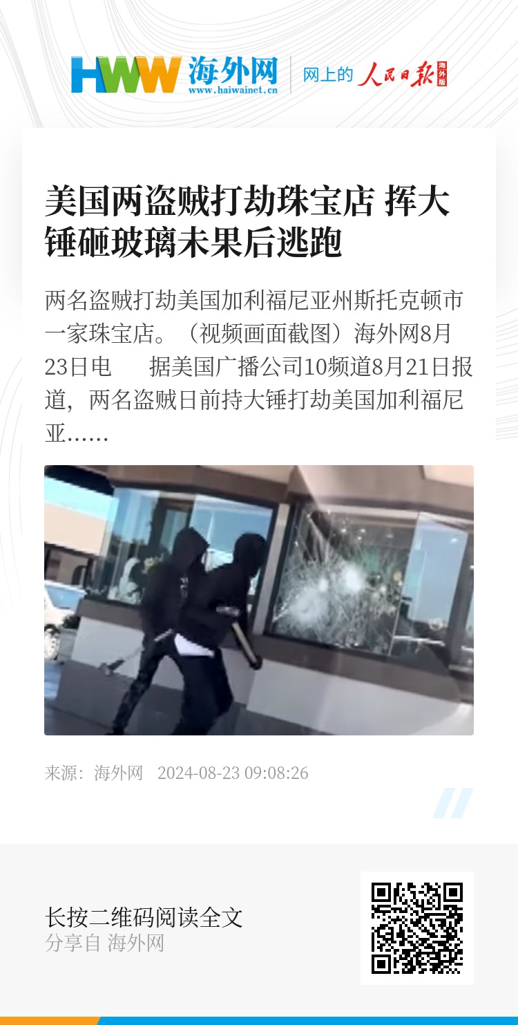 海外网8月23日电 据美国广播公司10频道8月21日报道,两名盗贼日前持大锤打劫美国加利福尼亚州斯托克顿市一家珠宝店,最终无功而返。