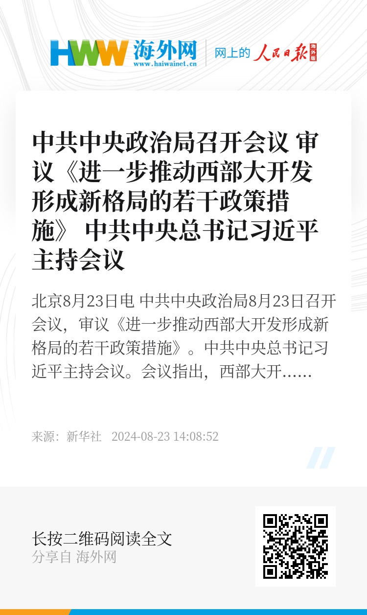 新华社北京8月23日电 中共中央政治局8月23日召开会议,审议《进一步推动西部大开发形成新格局的若干政策措施》。中共中央总书记习近平主持会议。
