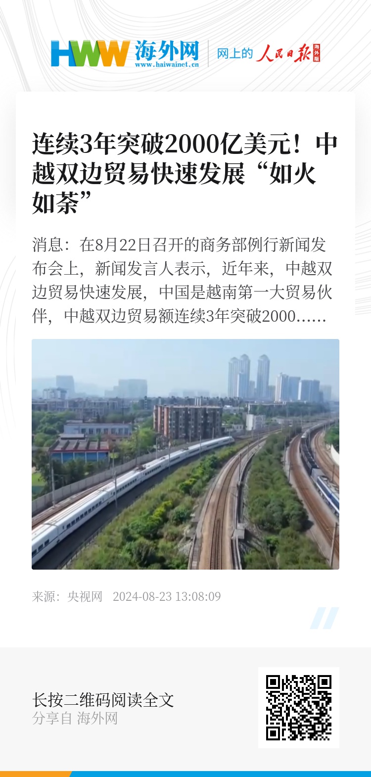 央视网消息:在8月22日召开的商务部例行新闻发布会上,新闻发言人表示,近年来,中越双边贸易快速发展,中国是越南第一大贸易伙伴,中越双边贸易额连续3年突破2000亿美元。
