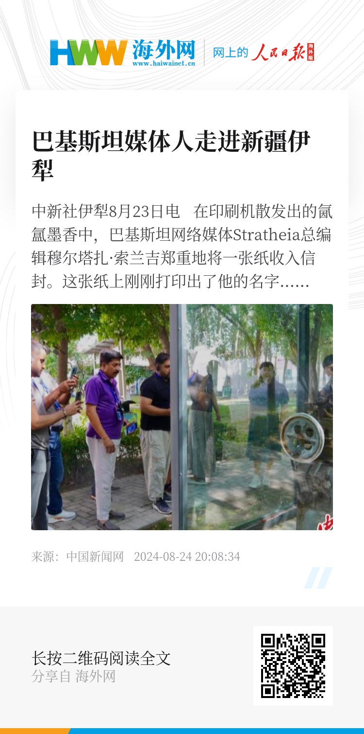 中新社伊犁8月23日电 在印刷机散发出的氤氲墨香中,巴基斯坦网络媒体Stratheia总编辑穆尔塔扎·索兰吉郑重地将一张纸收入信封。这张纸上刚刚打印出了他的名字:左侧用中文印刷,右侧则使用一种中国少数民族文字——锡伯文。