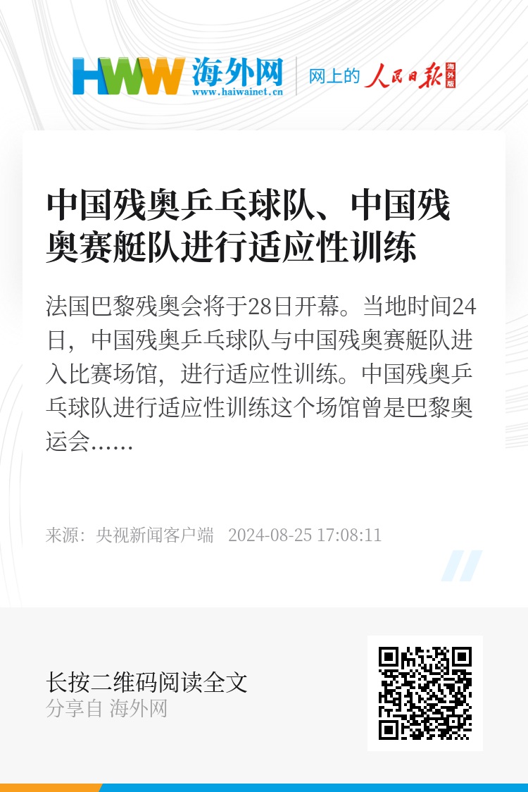 法国巴黎残奥会将于28日开幕。当地时间24日,中国残奥乒乓球队与中国残奥赛艇队进入比赛场馆,进行适应性训练。