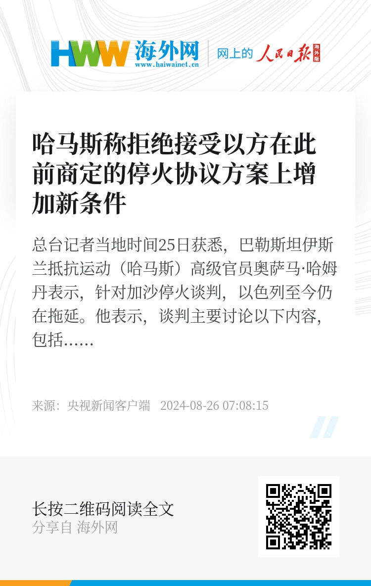 哈马斯方面此前曾多次表示,哈马斯承诺遵守并执行7月2日联合国安理会决议达成的涉及加沙停火及释放被扣押人员的相关协议内容,并敦促国际社会向以色列施压,要求其遵守协议,停止阻挠加沙停火的实现。(总台记者 王雪靖)