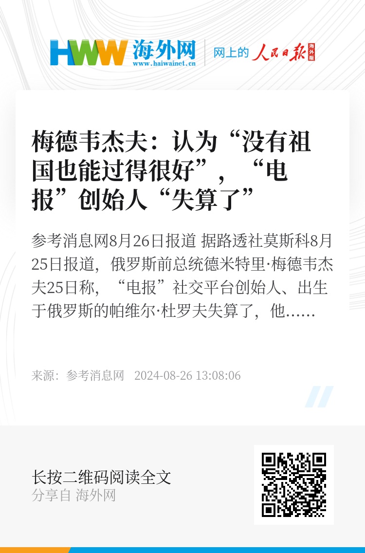 参考消息网8月26日报道 据路透社莫斯科8月25日报道,俄罗斯前总统德米特里·梅德韦杰夫25日称,“电报”社交平台创始人、出生于俄罗斯的帕维尔·杜罗夫失算了,他逃离俄罗斯,以为自己永远不必与国外的安全部门合作。