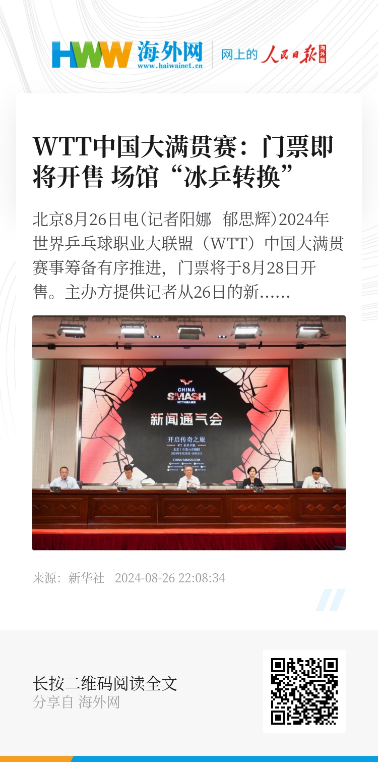 新华社北京8月26日电(记者阳娜 郁思辉)2024年世界乒乓球职业大联盟(WTT)中国大满贯赛事筹备有序推进,门票将于8月28日开售。