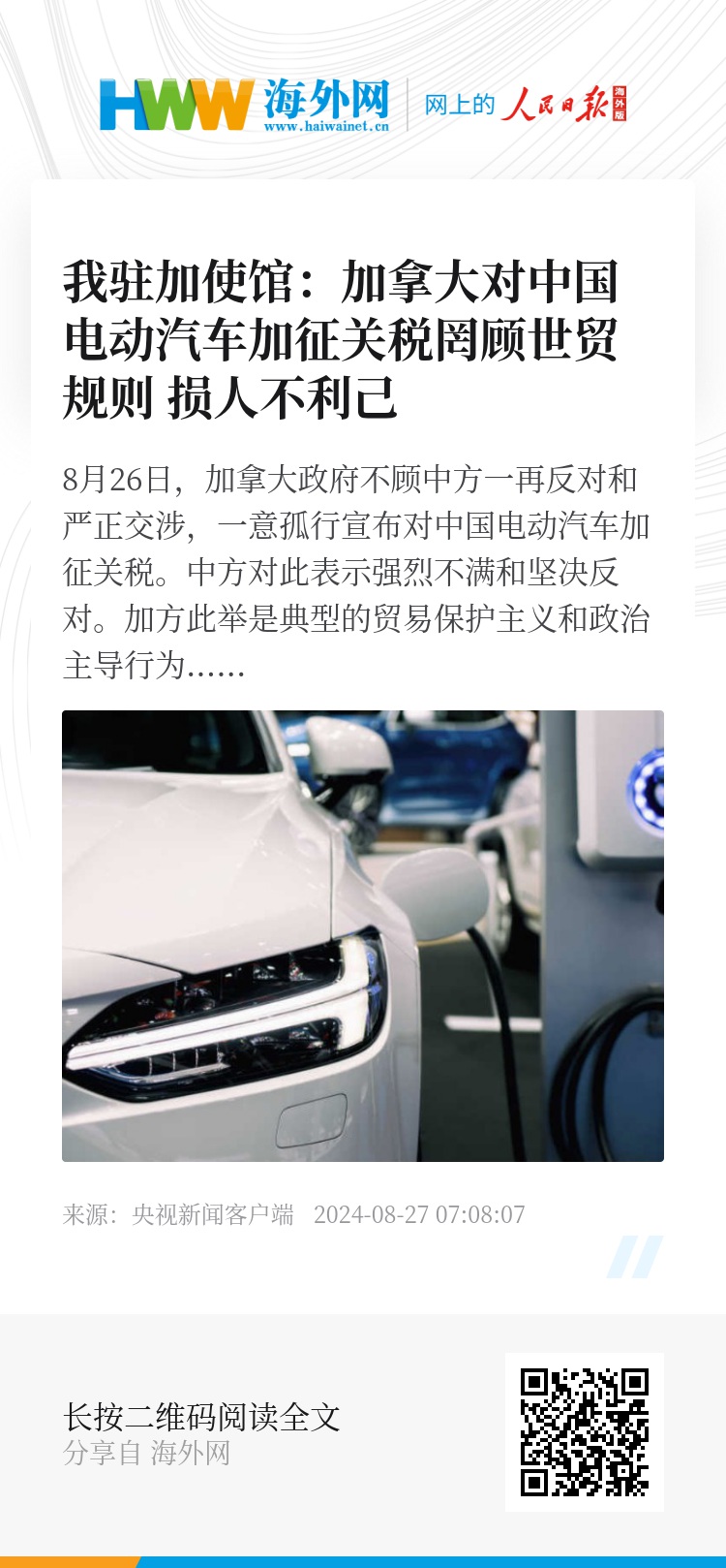 8月26日,加拿大政府不顾中方一再反对和严正交涉,一意孤行宣布对中国电动汽车加征关税。中方对此表示强烈不满和坚决反对。