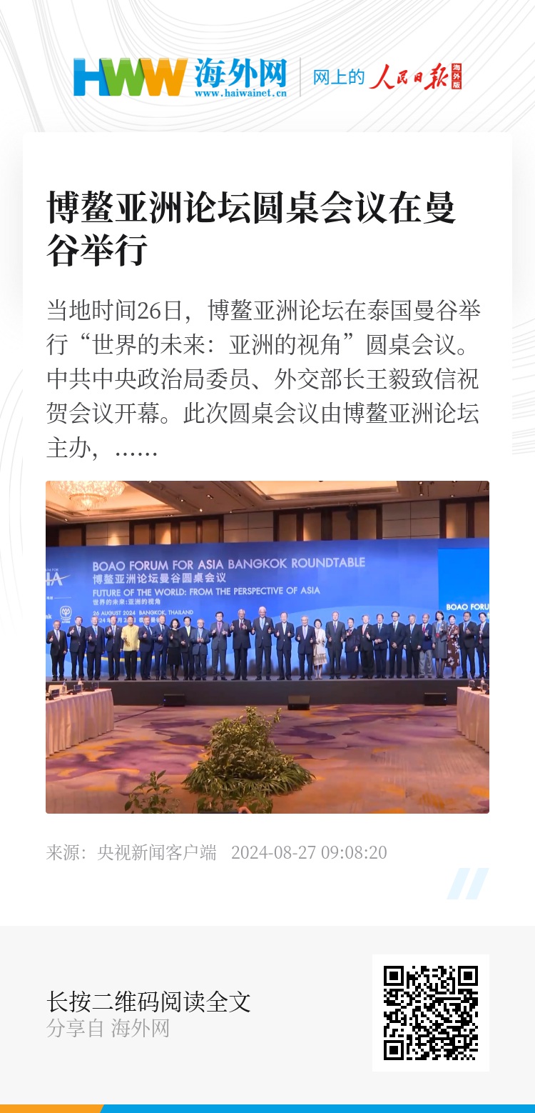 当地时间26日,博鳌亚洲论坛在泰国曼谷举行“世界的未来:亚洲的视角”圆桌会议。中共中央政治局委员、外交部长王毅致信祝贺会议开幕。
