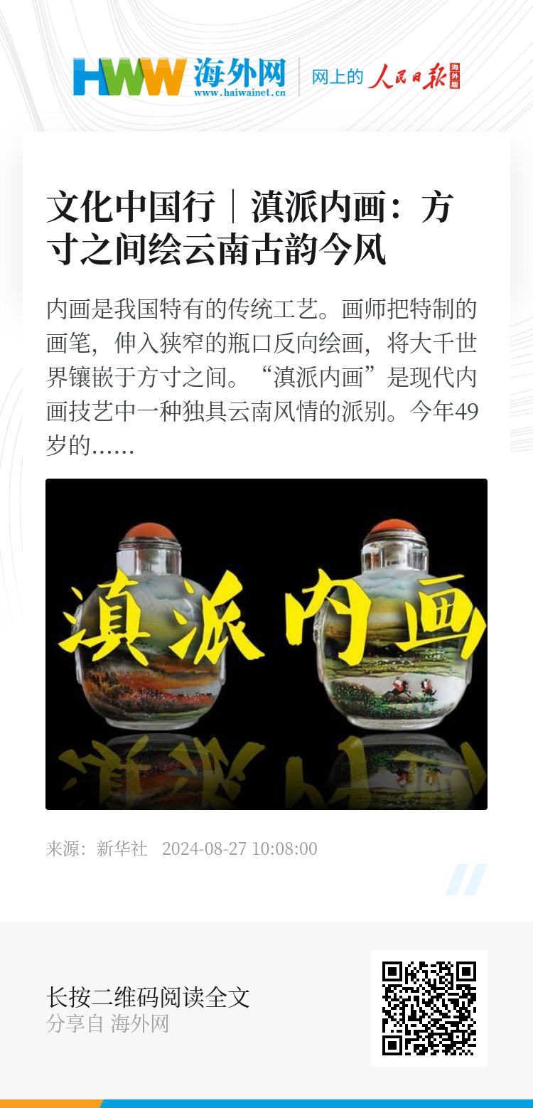 内画是我国特有的传统工艺。画师把特制的画笔,伸入狭窄的瓶口反向绘画,将大千世界镶嵌于方寸之间。“滇派内画”是现代内画技艺中一种独具云南风情的派别。
