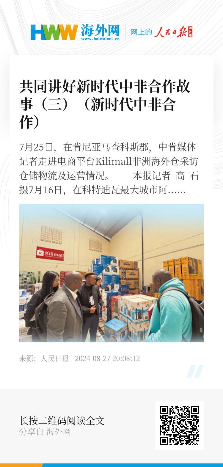 7月25日,在肯尼亚马查科斯郡,中肯媒体记者走进电商平台Kilimall非洲海外仓采访仓储物流及运营情况。